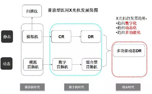 在靜態(tài)成像層面,X光機(jī)的發(fā)展經(jīng)歷了模擬機(jī)、CR、DR三個(gè)階段,成像速度越來越快,成像質(zhì)量越來越高。