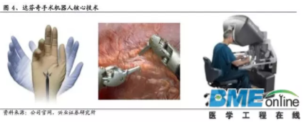 達(dá)芬奇手術(shù)機(jī)器人代表著當(dāng)今手術(shù)機(jī)器人最高水平,它有三個關(guān)鍵核心技術(shù):可自由運(yùn)動的手臂腕部Endo Wrist、3D高清影像技術(shù)、主控臺的人機(jī)交互設(shè)計。