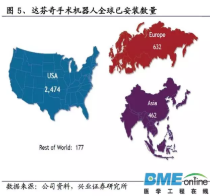 截至2017年6月,全球共有4149臺達(dá)芬奇,亞洲的數(shù)量占13%
