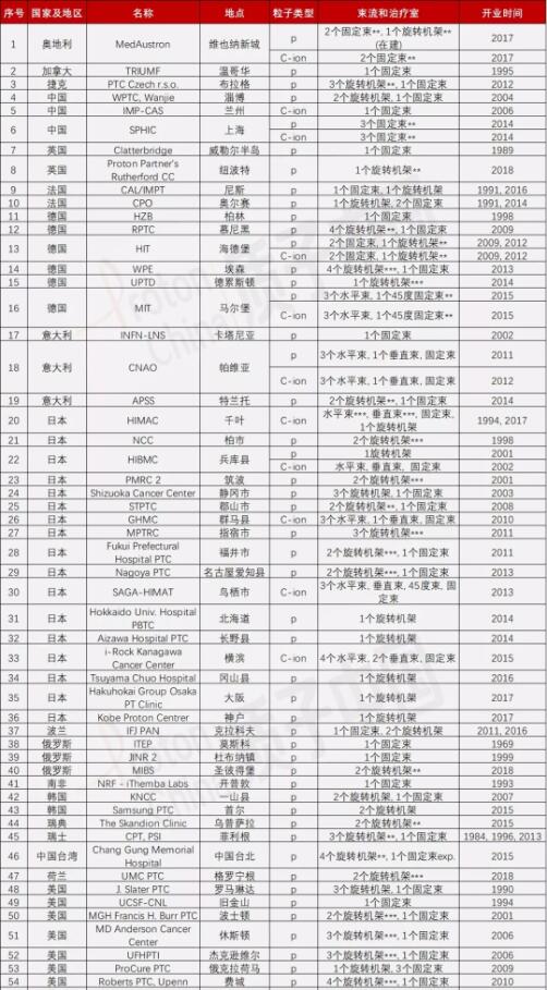附:全球已運(yùn)營質(zhì)子重離子治療中心匯總表(截至2018年7月)
