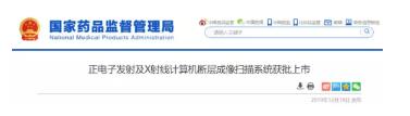 2019年12月19日,國(guó)家藥監(jiān)局發(fā)布消息,近日國(guó)家藥監(jiān)局批準(zhǔn)上海聯(lián)影醫(yī)療科技有限公司研制的創(chuàng)新醫(yī)療器械 “正電子發(fā)射及X射線計(jì)算機(jī)斷層成像掃描系統(tǒng)”。