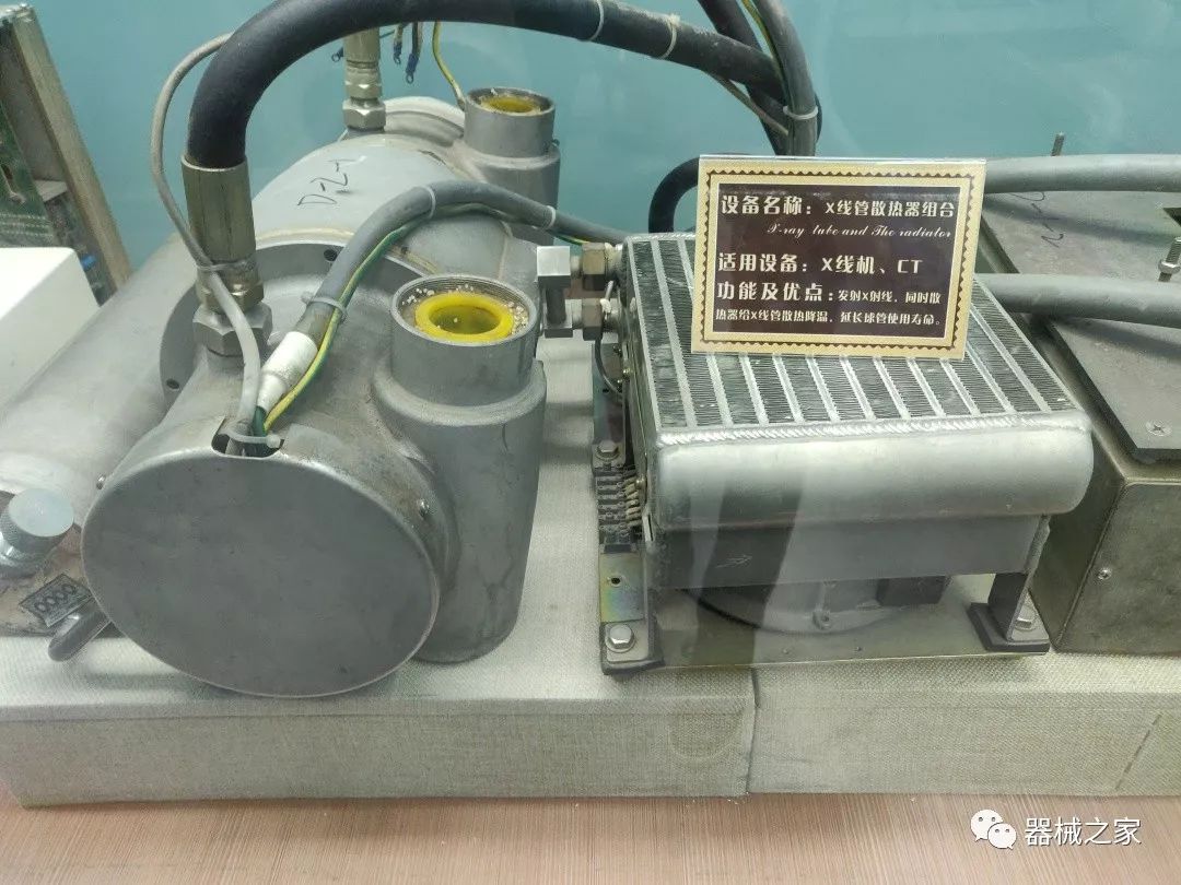 由于X線機產(chǎn)生X射線的過程中只有百分之一的動能轉(zhuǎn)化為X射線,其余的能量都以熱能的形式散失。這就需要良好的散熱設備,也就是這個散熱器。散熱器大多采用油冷。變壓器油不僅絕緣,而且能夠吸收散亂射線,防止擊穿。使用時,一般會用油泵將冷油泵入到球管周圍,將熱油從另一管導出,在冷卻板上冷卻,循環(huán)利用。