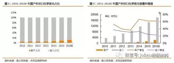 2016年化學(xué)發(fā)光市場(chǎng)容量接近200億,國(guó)產(chǎn)占比不到20億,但是只考慮總的市場(chǎng)容量是不合理的,因?yàn)橐阅壳皣?guó)產(chǎn)水平難以和進(jìn)口競(jìng)爭(zhēng),所以我們分析市場(chǎng)有效空間。