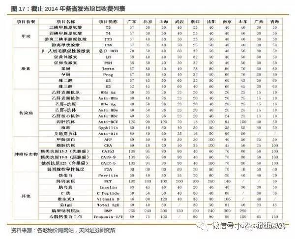 中國(guó)各個(gè)省的收費(fèi)標(biāo)準(zhǔn)差異較大,北京是以進(jìn)口和國(guó)產(chǎn)來區(qū)分,有些地方是按照醫(yī)院級(jí)別來區(qū)分價(jià)格,江浙幾乎不區(qū)分方法學(xué),大部分區(qū)域是分方法學(xué)收費(fèi),如下圖所示。最大收費(fèi)標(biāo)準(zhǔn)差異有接近10倍差異,但整體趨勢(shì)是類似的。即腫瘤相對(duì)價(jià)格高,傳染病價(jià)格相對(duì)較低,甲功和激素位于中位,另外一些不太普及的項(xiàng)目,比如骨代謝、維生素等等,價(jià)格起伏較大。