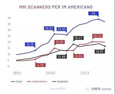 根據(jù)經(jīng)濟(jì)合作與發(fā)展組織(OECD)的數(shù)據(jù):1993年,美國(guó)每百萬(wàn)人的核磁共振掃描儀擁有量不到10臺(tái)。2004年,這一數(shù)字飆升至27臺(tái);而到2015年,數(shù)量已高達(dá)39臺(tái)。