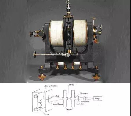 因?yàn)槊?xì)管靜電計(jì)的毛細(xì)血管不可能做的太細(xì),他無法測到更精確的電流,愛因托芬改進(jìn)了這個(gè)裝置,他利用通電的導(dǎo)體可以產(chǎn)生磁場的安培右手定律發(fā)明了----磁電式儀表。愛因托芬把提高靈敏度的任務(wù)完全交給超大的電磁鐵,而動圈以匝數(shù)最少,質(zhì)量最輕為目標(biāo)。最終的結(jié)果是1895年推出的弦線式電流計(jì)---看清楚還不是心電圖機(jī)。