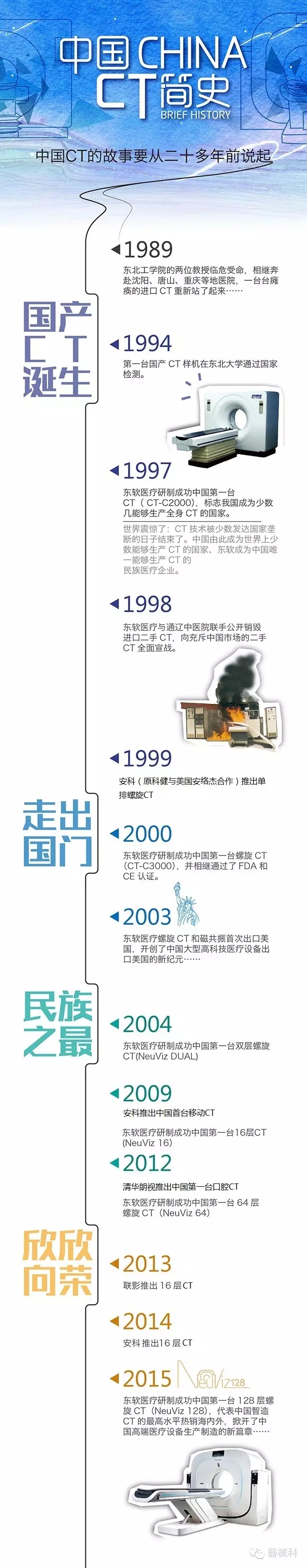 中國第一臺自主研制的CT樣機面世,標(biāo)志著中國成為世界上第四個能夠自行設(shè)計,生產(chǎn)全身CT的國家。