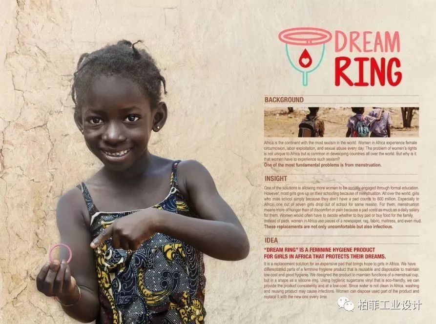 設計說明:非洲婦女每天都會經(jīng)歷性別偏見和歧視,而針對這個問題所提出的解決方案是讓更多的女性參與正規(guī)教育。無法取得便宜且衛(wèi)生的女性衛(wèi)生用品是許多非洲女孩放棄上學的主要原因之一。一片衛(wèi)生棉可能會花掉一天的工資,迫使婦女在經(jīng)期來時會使用報紙、破布、布料甚至泥土。DREAM RING是一款便宜又環(huán)保的女性衛(wèi)生用品,由矽膠環(huán)和甘蔗乙烯制成。可重復使用的矽膠環(huán)和拋棄式的甘蔗乙烯是DREAM RING既經(jīng)濟又安全的關鍵因素。