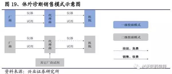 醫(yī)院是產(chǎn)業(yè)鏈上最強勢的一環(huán),國產(chǎn)產(chǎn)品對醫(yī)院的吸引力決定著國產(chǎn)替代進程。在銷售模式上,公司多采用直銷和經(jīng)銷相結合,以經(jīng)銷為主。對于醫(yī)院終端,儀器基本以投放獲得,廠商以搭配銷售試劑的方式獲得收益。體外檢測等醫(yī)療服務由政府統(tǒng)一定價,應用化學發(fā)光法可相應提高收費標準(例如:福建省用化學發(fā)光法可加價80%)。因此,試劑屬于醫(yī)院的“成本項”,醫(yī)院有動力對檢測方法進行升級迭代,但卻并沒有動力去特意抬高價格,在相同條件下會考慮試劑性價比,相對市場化。