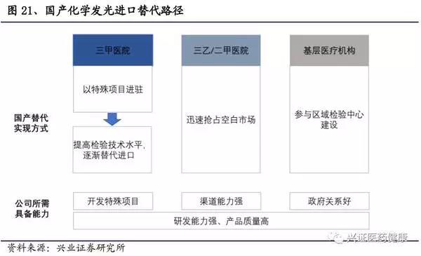 對于三甲醫(yī)院,其技術偏好較高,從目前的市場反應來看,國產(chǎn)發(fā)光儀器和試劑的精確性和穩(wěn)定程度仍不能達到三甲醫(yī)院的要求。同時三甲醫(yī)院多有聲譽追求,對進口品牌的忠誠度高。在價格上,樣本量大、檢驗結果質(zhì)量要求高、檢驗人員成本高致使其相對價格不敏感。而國內(nèi)廠家對于試劑的研發(fā)仍停留在檢測項目的拓展上,基于現(xiàn)狀,大規(guī)模進口替代較難實現(xiàn)。有些特殊項目未涉及,如藥物濃度檢測等,可作為突破口進駐高端醫(yī)院,建立品牌形象??傮w來說,短期內(nèi)國內(nèi)廠商可依靠特殊項目檢查可獲得三級醫(yī)院小部分份額,長期來看,想進駐高端醫(yī)院并獲得主力項目的份額,須加大研發(fā)投入,做好做精發(fā)光試劑,打破醫(yī)院對于國產(chǎn)山寨的慣性認知。