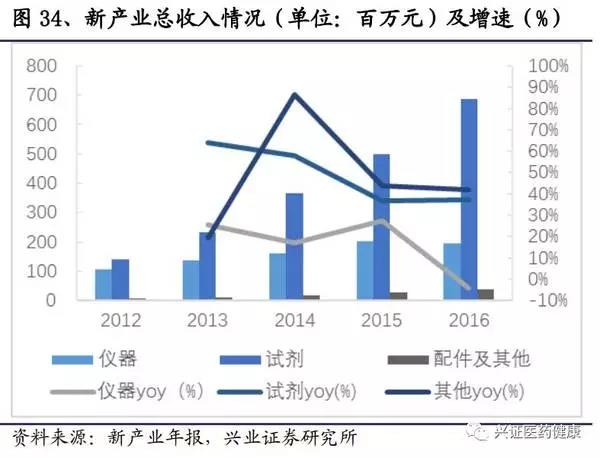 新產(chǎn)業(yè)2016年總收入9.23億元,絕大部分為發(fā)光產(chǎn)品,2012-2016年,新產(chǎn)業(yè)收入復合增速保持在37%左右。其中試劑增速較高,保持在35%以上,隨著儀器投放的增加,試劑的增速將會上升。由于近幾年空白市場將逐漸被消化,儀器的增速將呈現(xiàn)下降的態(tài)勢。