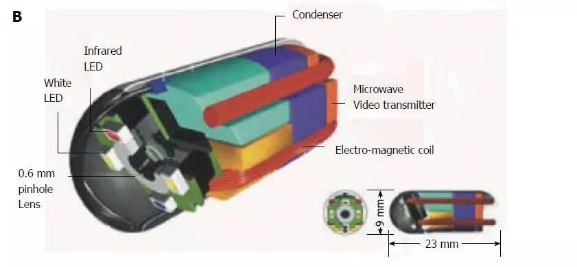 膠囊內(nèi)鏡的尺寸為9 mm×23 mm,0.6毫米彩色鏡頭和410000像素電荷耦合設(shè)備相機(jī)可以獲得高達(dá)每秒30幀(fps),只需患者穿著將微波傳輸?shù)侥z囊的背心。兩個罐與閥定位在中心和一個有用于存儲電力以及微波視頻信號發(fā)射機(jī)。在相機(jī)鏡頭周圍,放置了四個白色LED和用于調(diào)焦的磁線圈。更重要的是,40%的體積是自由空間,可用于手術(shù)目的,如藥物噴霧,激光治療,pH傳感等。雖然這種膠囊已經(jīng)在網(wǎng)上描述了十多年,至今仍沒有對這種膠囊進(jìn)行人體實驗。