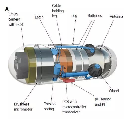 它配有3個微型腿,每個腿都帶有一個輪子。這些腿伸出和縮回得益于微電機(jī)和三個定做扭力彈簧。通過記錄它們執(zhí)行的每個旋轉(zhuǎn),車輪專門設(shè)計用作微型里程表。當(dāng)Odocapsule穿過小腸時,輪子轉(zhuǎn)動并且它們的旋轉(zhuǎn)被轉(zhuǎn)換到裝置覆蓋的距離,從十二指腸進(jìn)入點到每個感興趣的區(qū)域/點。