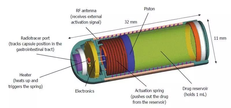 當(dāng)彈簧釋放時,Enterion能夠通過9毫米開口輸送任何類型的藥物配方(包括干粉,半固體,懸浮液或溶液配方),迫使活塞沿著膠囊的軸移動,從而,清空所述容器到胃腸道的特定位置。將放射性標(biāo)記物放置在單獨的密封示蹤劑端口內(nèi),以允許使用γ閃爍掃描法實時觀察膠囊位置。活塞的運(yùn)動還操作開關(guān),該開關(guān)以精確的頻率傳輸弱無線電信號。這個信號的檢測從外部確認(rèn)膠囊已成功?;钊\(yùn)動在膠囊末端附近停止,這保持了密封并防止內(nèi)部電子元件與GI流體接觸。