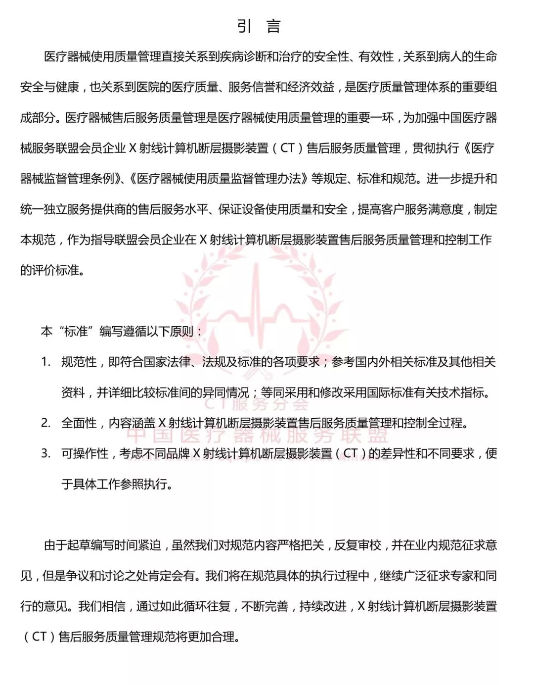醫(yī)療器械售后服務(wù)質(zhì)量管理是醫(yī)療器械使用質(zhì)量管理的重要一環(huán),為加強(qiáng)e中國醫(yī)療器械服務(wù)聯(lián)盟會(huì)員企業(yè)X射線計(jì)算機(jī)斷層攝影裝置(CT)售后服務(wù)質(zhì)量管理,貫徹執(zhí)行《醫(yī)療器械監(jiān)督管理條例》、《醫(yī)療器械使用質(zhì)量監(jiān)督管理辦法》等規(guī)定、標(biāo)準(zhǔn)和規(guī)范,進(jìn)一步提升和統(tǒng)一獨(dú)立服務(wù)提供商的售后服務(wù)水平、保證設(shè)備使用質(zhì)量和安全,提高客戶服務(wù)滿意度,制定本規(guī)范,作為指導(dǎo)聯(lián)盟會(huì)員企業(yè)在X射線計(jì)算機(jī)斷層攝影裝置售后服務(wù)質(zhì)量管理和控制工作的評(píng)價(jià)標(biāo)準(zhǔn)。